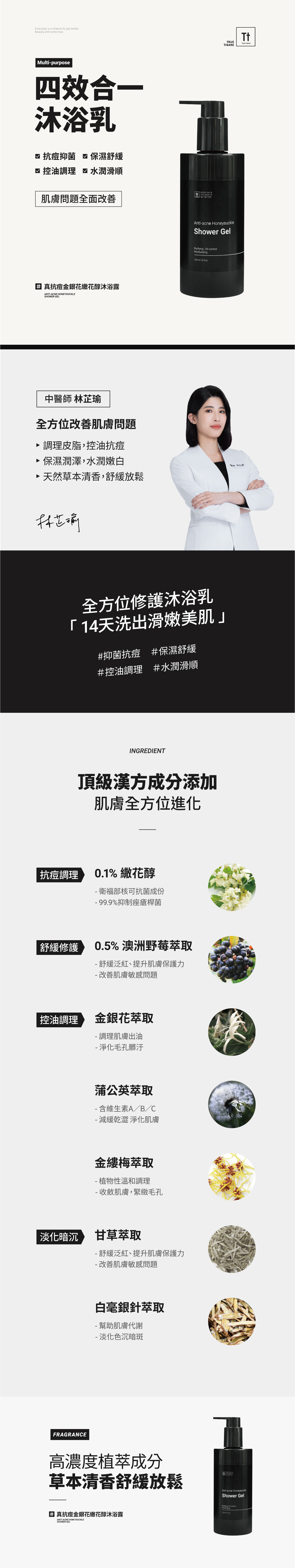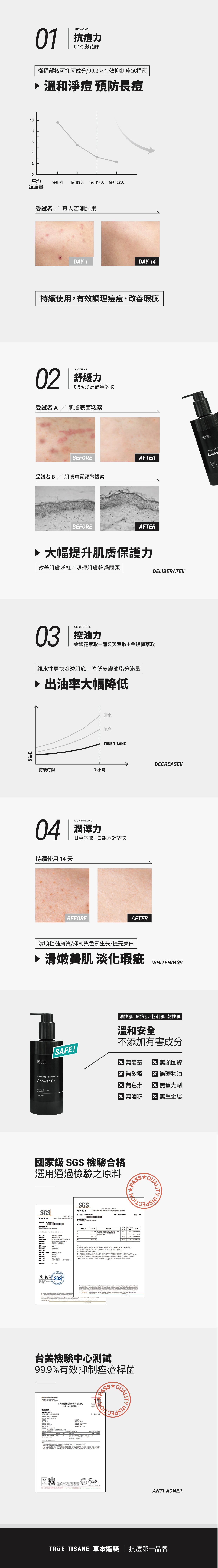 獲得政府認證實驗室報告的沐浴乳,有效改善痘痘,舒緩乾燥,調控皮脂出油,肌膚越洗越滑順。