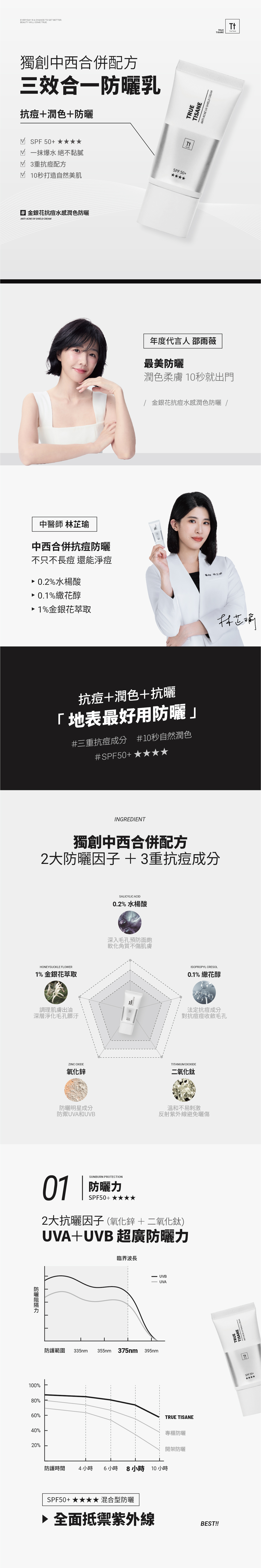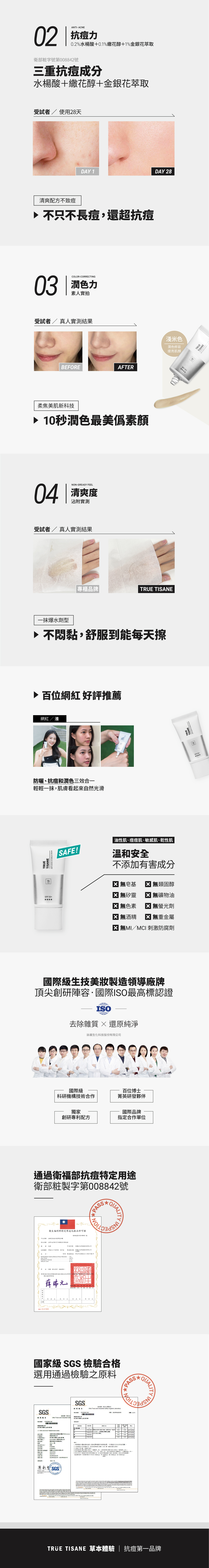 獨創3效合一:防曬+抗痘+潤色。超水感透氣,不只不長痘,還超抗痘,自然潤色10秒打造天然美顏。